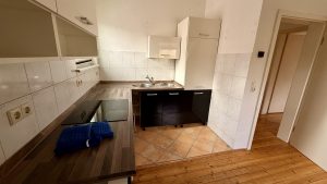 Die Wohnung sollte bei Einzug entsprechend der eigenen Vorlieben gestrichen oder tapeziert werden. Die abgebildeten Küchenelemente (leicht reparaturbedürftig) und Hängeschränke sowie das Sofa im Wohnzimmer können ablösefrei übernommen oder verschrottet werden.